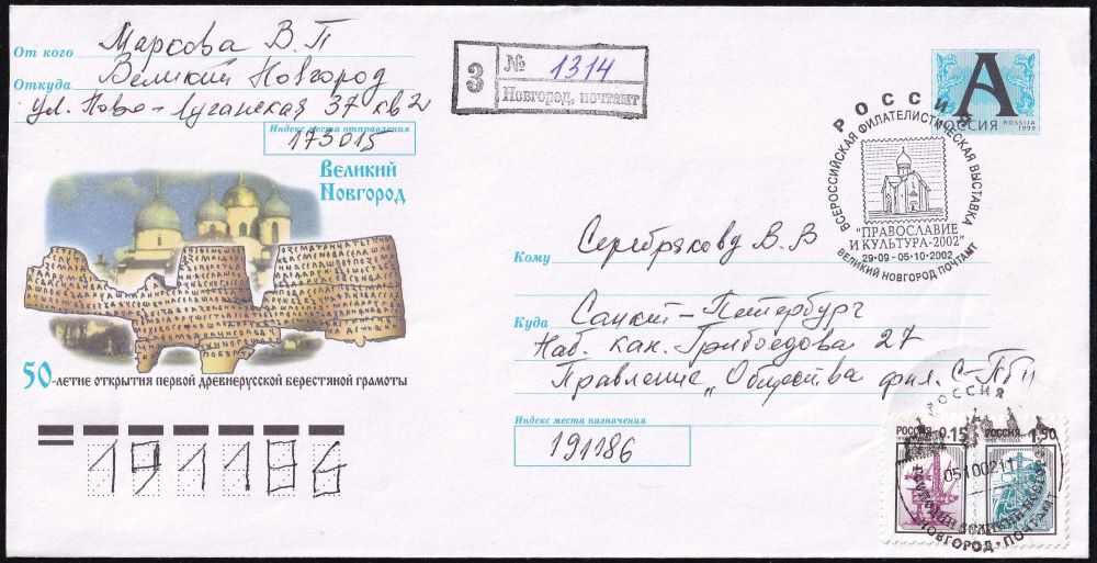 Конверт со спецгашением - Филвыставка "Православие и культура", 29.09-5.10.2002, Великий Новгород, прошёл почту