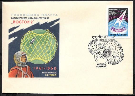 Конверт со спецгашением - Годовщина полета космического корабля - спутника "Восток - 2". Москва, 1962 год