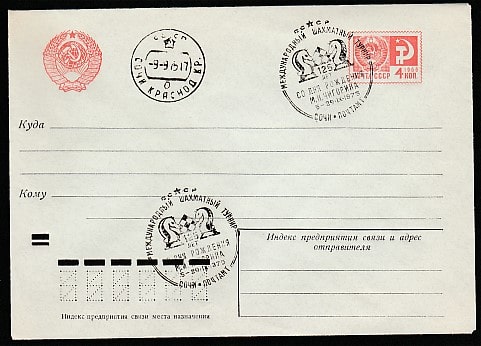 Конверт со спецгашением. Международный шахматный турнир памяти М.И. Чигорина, 05-29.09.1975 год, Сочи, почтамт
