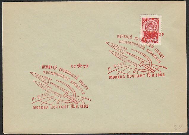 Конверт со спецгашением. Первый групповой полёт космических кораблей "Восток-3" и "Восток-4", 15.08.1962 год, Москва (Ю)