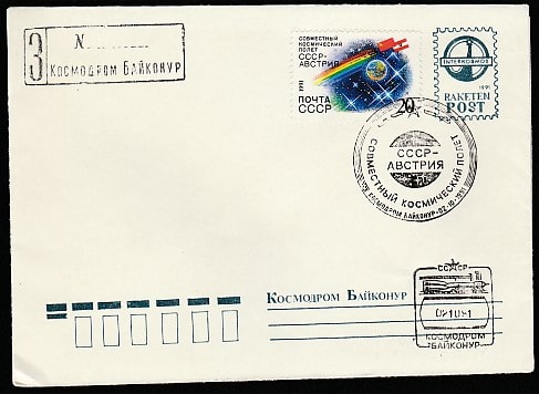 Конверт со спецгашением. Совместный космический полёт СССР - Австрия, 02.10.1991 год, космодром Байконур ( 2Ю)