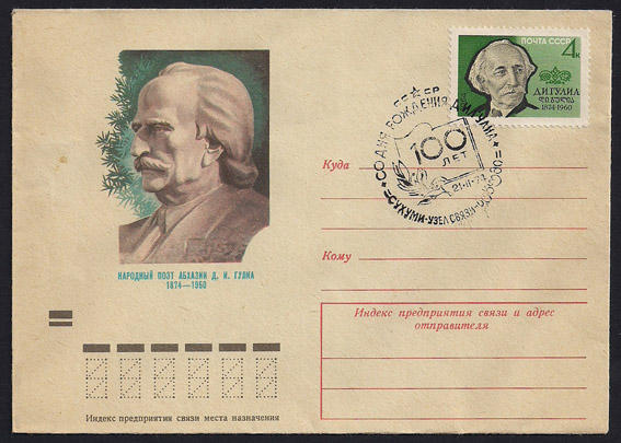 Конверт со СГ. 100 лет со дня рождения Гулиа. Гашение - 21.11.1974 г. Сухуми.