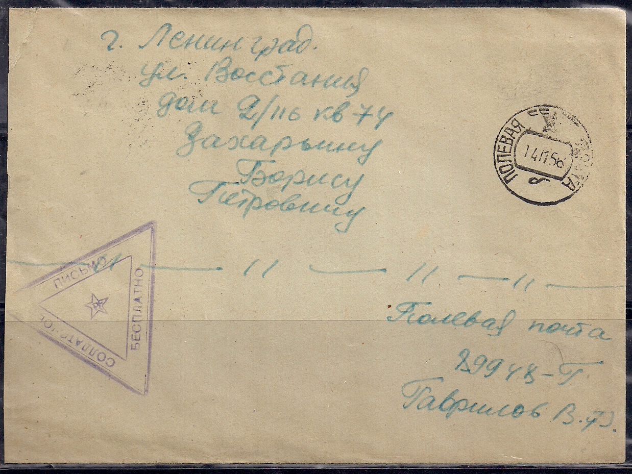 Конверт. Солдатское письмо, 1956 год, штемпель "полевая почта", прошло почту