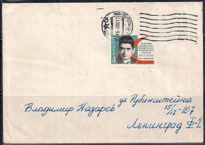 Конверт. Совершен полет трехместного космического корабля "Восход", врач-космонавт Б.Б. Егоров, наклеена марка 1964 год, прошел почту