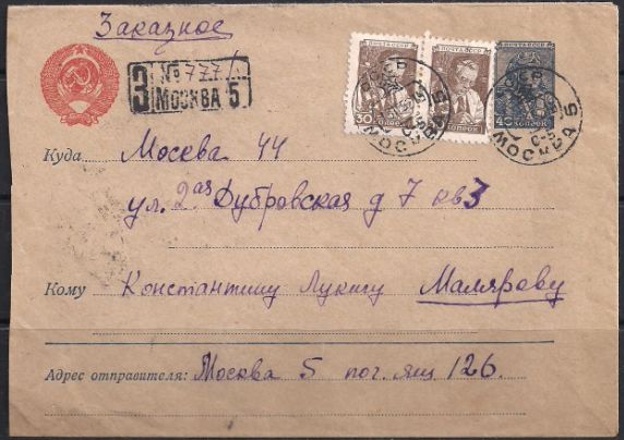 Конверт СССР 1952 год, заказной, прошел почту (ю)