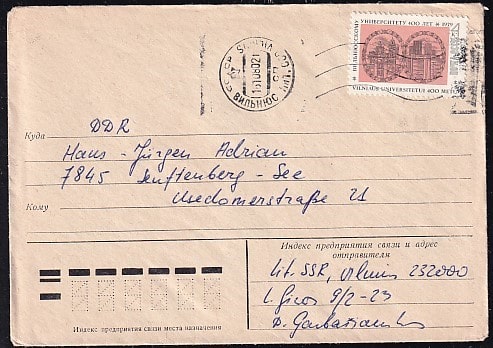 Конверт Вильнюсскому Университету 400 лет, 1980 год, прошел почту (ГДР-Лит.ССР)
