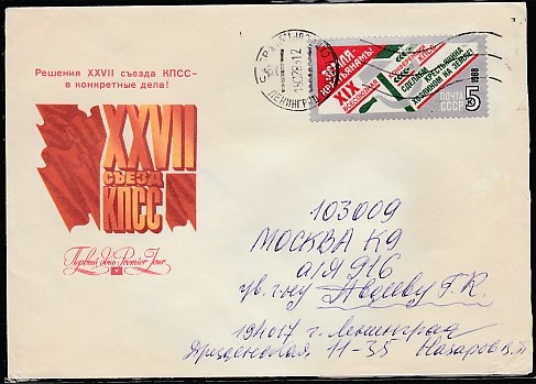 Конверт. XIX Всесоюзная конференция КПСС. "Земля крестьянам!", 1988 год, прошёл почту