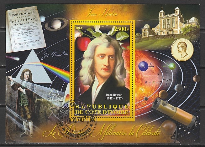 Кот дИвуар 2012 год. Английский физик и астроном Исаак Ньютон, гашёный блок Сувенирный выпуск.