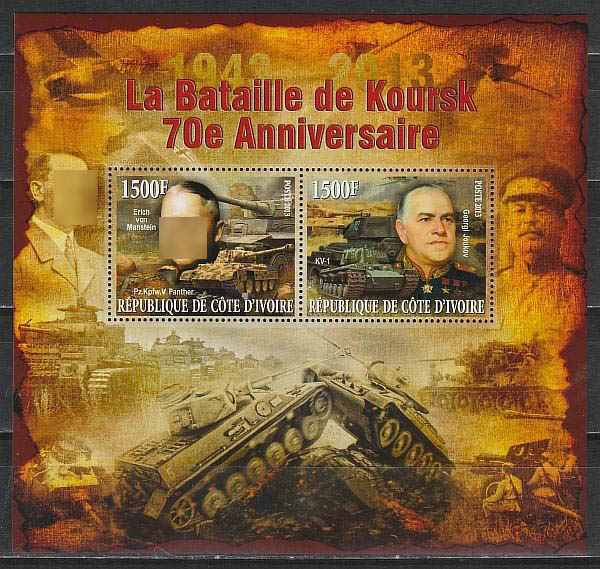 Кот дИвуар 2013 год. 70 лет Курской битве. Танки Тигр и Т-34, Пантера и КВ-1. 1 малый лист и 1 блокСувенирный выпуск.