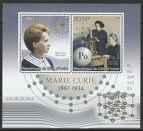 Кот дИвуар 2016 год. Французский физик Мария Склодовская-Кюри, малый лист. Сувенирный выпуск.