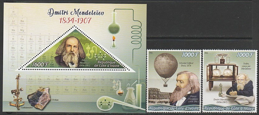 Кот дИвуар 2016 год. Русский учёный Д.И. Менделеев, 2 марки + блок.