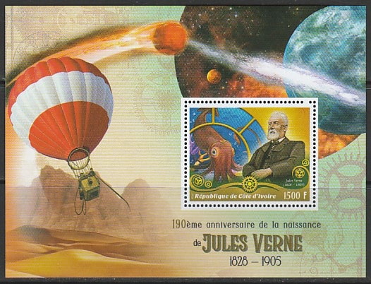 Кот дИвуар 2018 год. 190 лет со дня рождения писателя Жюля Верна, блок.