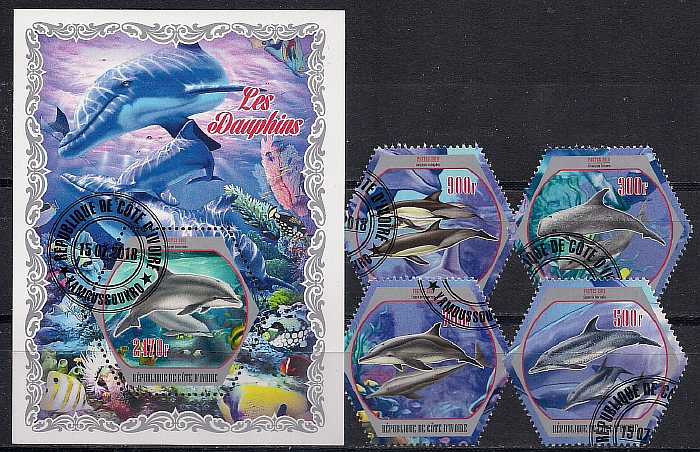 Кот дИвуар 2018 год. Дельфины. Гашеные 4 марки и блок