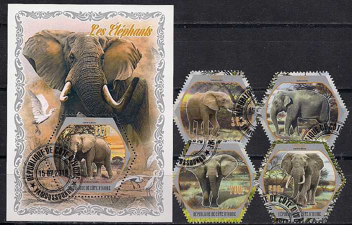 Кот дИвуар 2018 год. Слоны. Гашеные 4 марки и блок