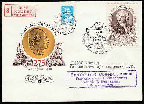 КПД. 275 лет со дня рождения М.В. Ломоносова, 19.11.1986 год, Москва, почтамт