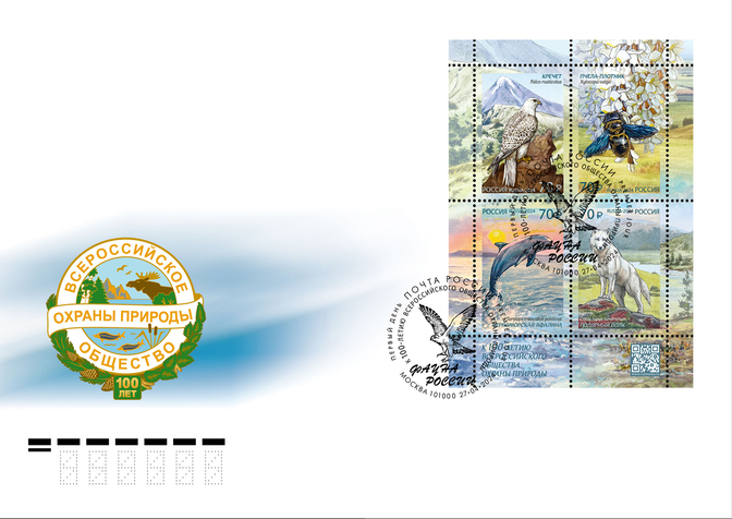 На почтовых марках изображены кречет, пчела-плотник, черноморская афалина, полярный волк.