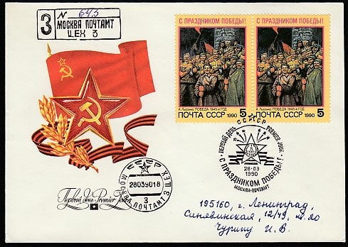 КПД. С Праздником Победы! 28.03.1990 год, Москва, почтамт, заказное, прошёл почту