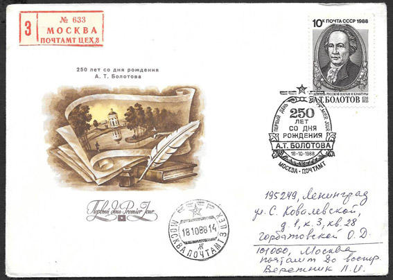 КПД со спецгашением - 250 лет со дня рождения А. Т. Болотова. 18.10.1988 г. (почта)