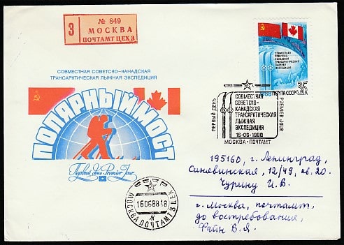 КПД. Совместная советско - канадская трансарктическая лыжная экспедиция, 16.06.1988 год, Москва, почтамт, прошёл почту