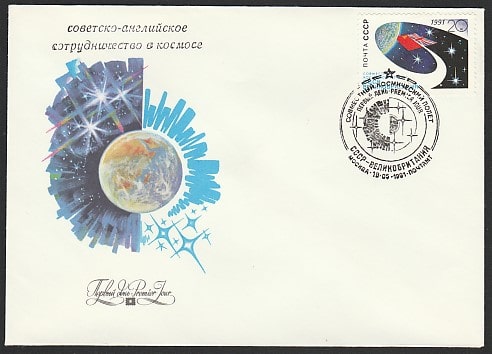 КПД. Совместный космический полёт СССР - Великобритания, 18.05.1991 год, Москва, почтамт ( 1Ю). с надпечаткой Надпечатка на конверте:советско - английское сотрудничество в космосе.