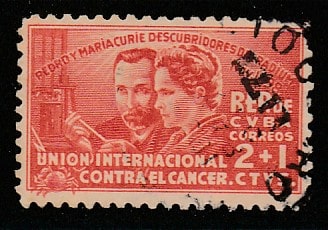 Куба 1938 год. Физики Пьер и Мари Кюри, 1 марка (гашёная)