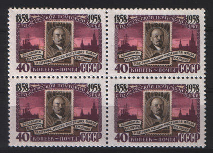 СССР 1958 год. Квартблок марок 100 лет почтовой марке. Ленин.