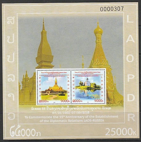Лаос 2015 год. Лаос - Россия, 55 лет дипотношениям. Храмы. Совместный выпуск, блок. ЗУБЦОВЫЙ