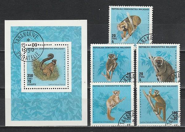 Лемуры, Мадагаскар 1990 год, 5 гашёных марок + блок