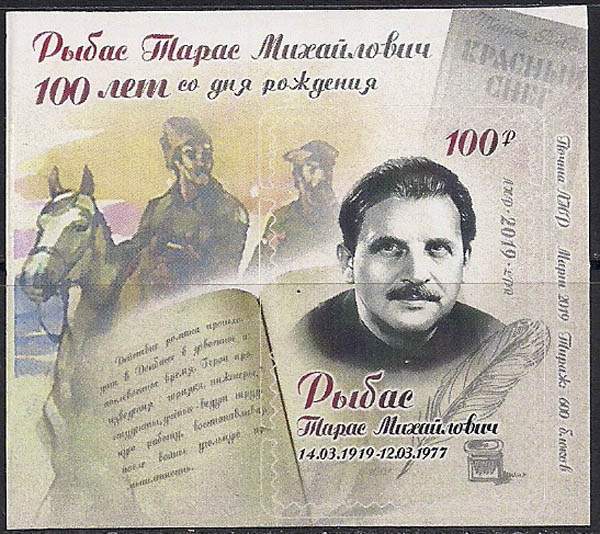 ЛНР 2019 год. 100 лет со дня рождения писателя Тараса Михайловича Рыбаса. 1 блок БРАК