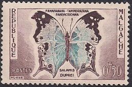 Мадагаскар 1960 год. Бабочка саламис дюпрей (ном. 0,5). 1 марка из серии с наклейкой (1м)