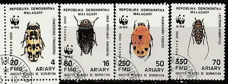 Мадагаскар 1988 год. Насекомые, 4 гашёные марки (Mix чист 90 уе, гаш 30 уе)