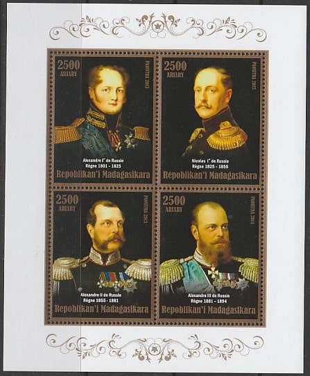 Мадагаскар 2013 год. 400 лет Династии Романовых, малый лист (II) Сувенирный выпуск.