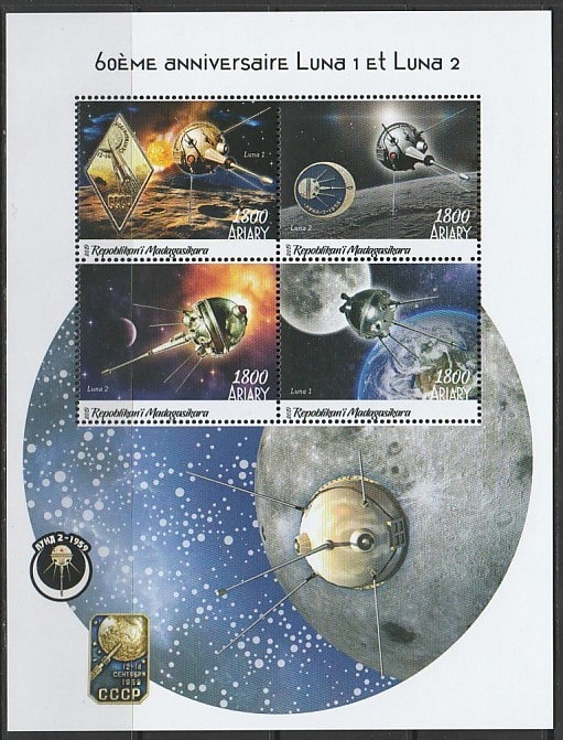 Мадагаскар 2019 год. 60 лет запуску космических аппаратов "Луна-1" и "Луна-2", малый лист. Сувенирный выпуск.