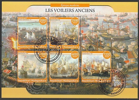 Мадагаскар 2020 год. Парусные корабли, малый лист (гашёный). Залом вверху