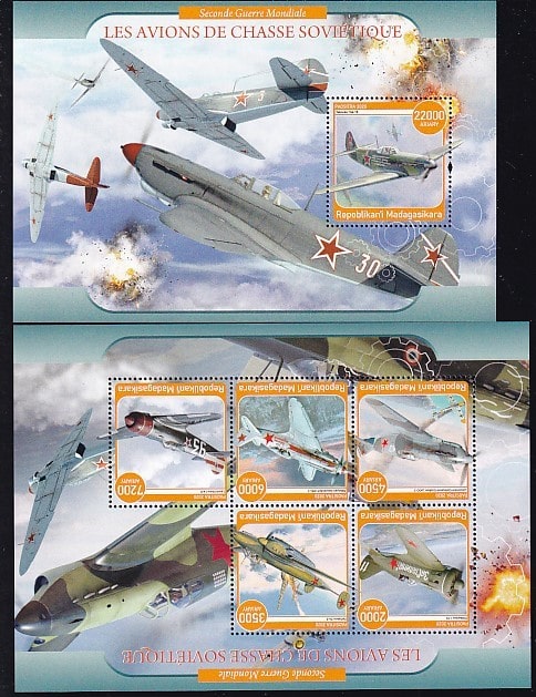 Мадагаскар 2020 год. Советские истребители. Вторая мировая война, блок и малый лист
