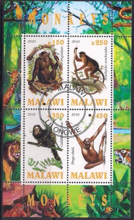 Малави 2010 год. Обезьяны. Гашеный малый лист