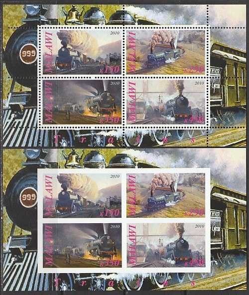 Малави 2010 год. Паровозы (III), 2 малых листа (1 зубц. + 1 б/зубц.) Сувенирный выпуск.