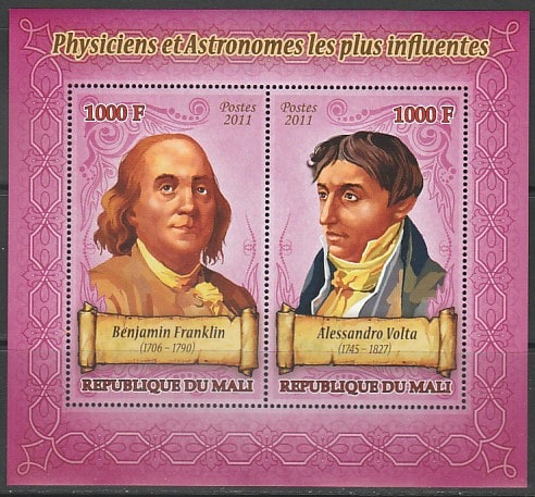Мали 2011 год. Учёные: Бенджамин Франклин и Алессандро Вольта, блок.