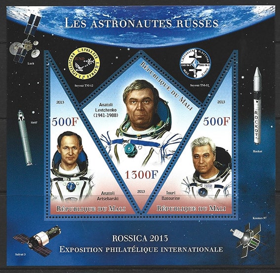 Мали 2013 год. Космонавты. Анатолий Арцебарский, Анатолий Левченко, Юрий Батурин, блок