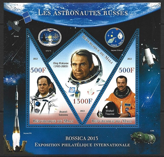 Мали 2013 год. Космонавты. Олег Макаров, Анатолий Соловьев, Михаил Тюрин, блок