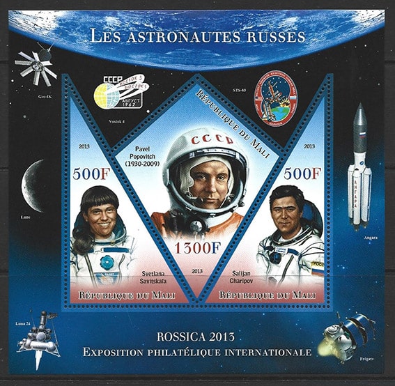 Мали 2013 год. Космонавты. Павел Попович, Светлана Савитская, Салижан Шарипов, блок