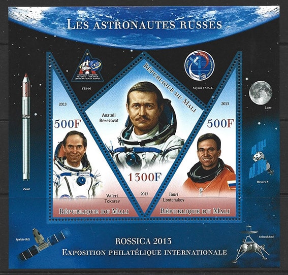 Мали 2013 год. Космонавты. Валерий Токарев, Анатолий Березовой, Юрий Лончаков, блок