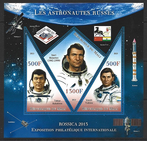 Мали 2013 год. Космонавты. Юрий Малышев, Токтар Аубакиров, Василий Циблиев, блок