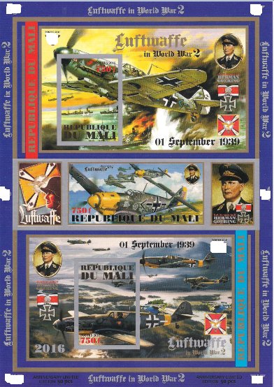 Мали 2016 год. Войска Люфтваффе в ВОВ. Лист Сувенирный выпуск