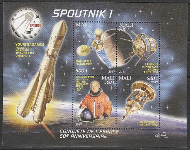 Мали 2017 год. 60 лет запуску первого искусственного спутника Земли, малый лист (II) Сувенирный выпуск.