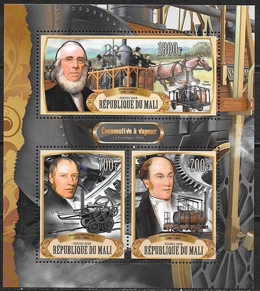 Мали 2018 год. Изобретатели. Питер Купер, Ричард Тревитик, Тимоти Хакворт, малый лист