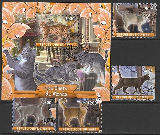 Мали 2020 год. Домашние кошки, 4 марки + блок (гашёные) Сувенирный выпуск.