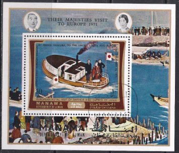 Манама (Аджман) 1971 год. Визит императорской пары Японии в Европу. Гашеный блок
