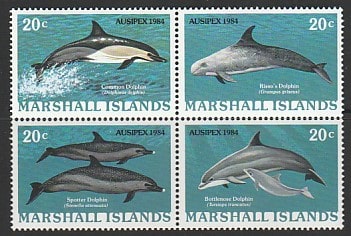 Маршалловы Острова 1984 год. Дельфины. Международная филвыставка "AUSIPEX-84" в Мельбурне, квартблок (224.19)