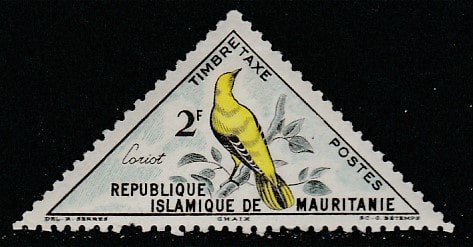 Мавритания 1963 год. Птицы: иволга, ном. 2 Fr, 1 доплатная марка из серии (наклейка)